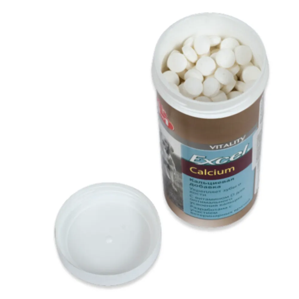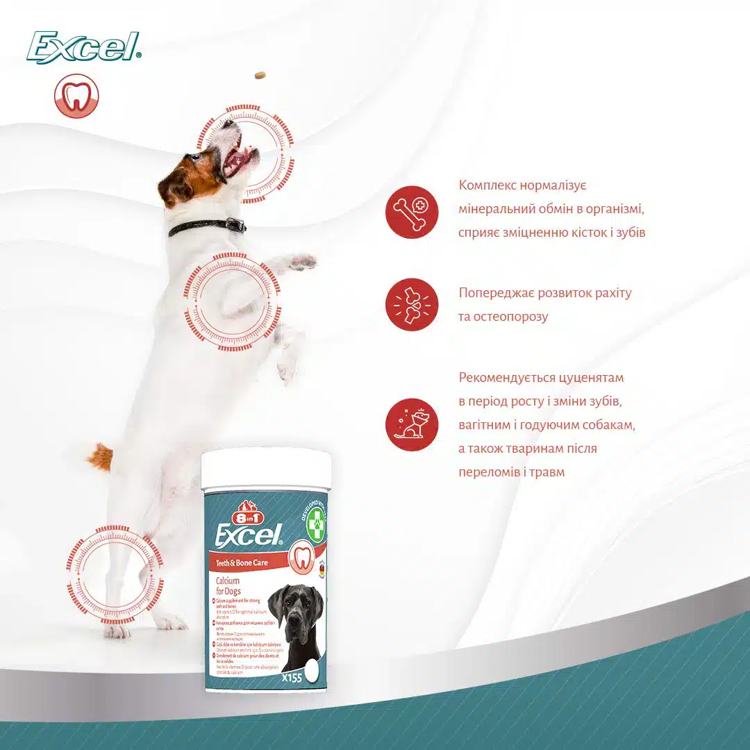 Кальцій для собак Excel Calcium – це добавка для цуценят і дорослих собак з кальцієм і фосфором, що забезпечує здоров’я кісток і зубів. Формула збагачена вітаміном D3 і забезпечує оптимальне засвоєння кальцію. Таблетки Ексель Кальцій особливо рекомендуються цуценятам в період їх активного росту, а також для вагітних і годуючих собак.
