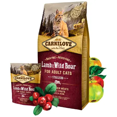 Корм для собак і котів Carnilove - один з найпопулярніших брендів у світі. Carnilove виготовляється з високоякісного м'яса, такого як дикий кабан, буйвол, копчений лосось та індичка, а також смажений бізон, ягня, перепілка, оленина та качка. Лісові фрукти, овочі, дикі ягоди та трави є природними джерелами важливих вітамінів, антиоксидантів та інших необхідних поживних речовин. 70 - 75% м'яса диких тварин. Кожна формула не містить зернових і забезпечує тривалу енергію завдяки складним вуглеводам з солодкої картоплі та бобових. Ці легкозасвоювані білки та багаті на клітковину вуглеводи допоможуть вашому собаці та коту почуватися ситими та енергійними протягом усього дня.