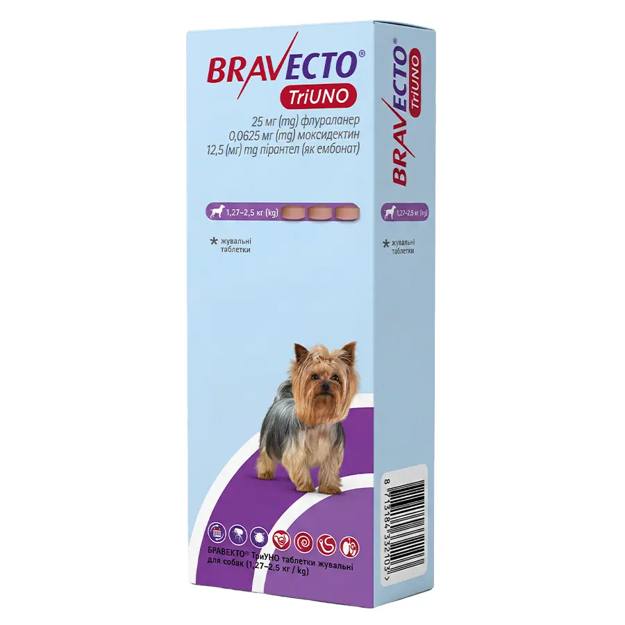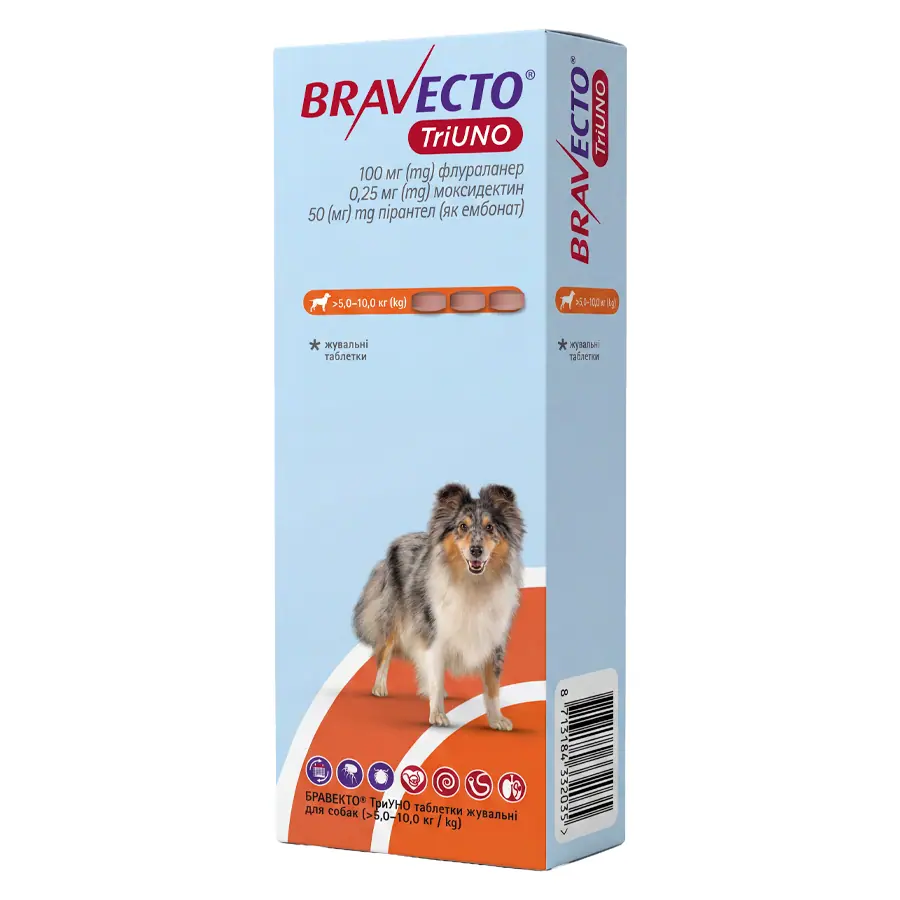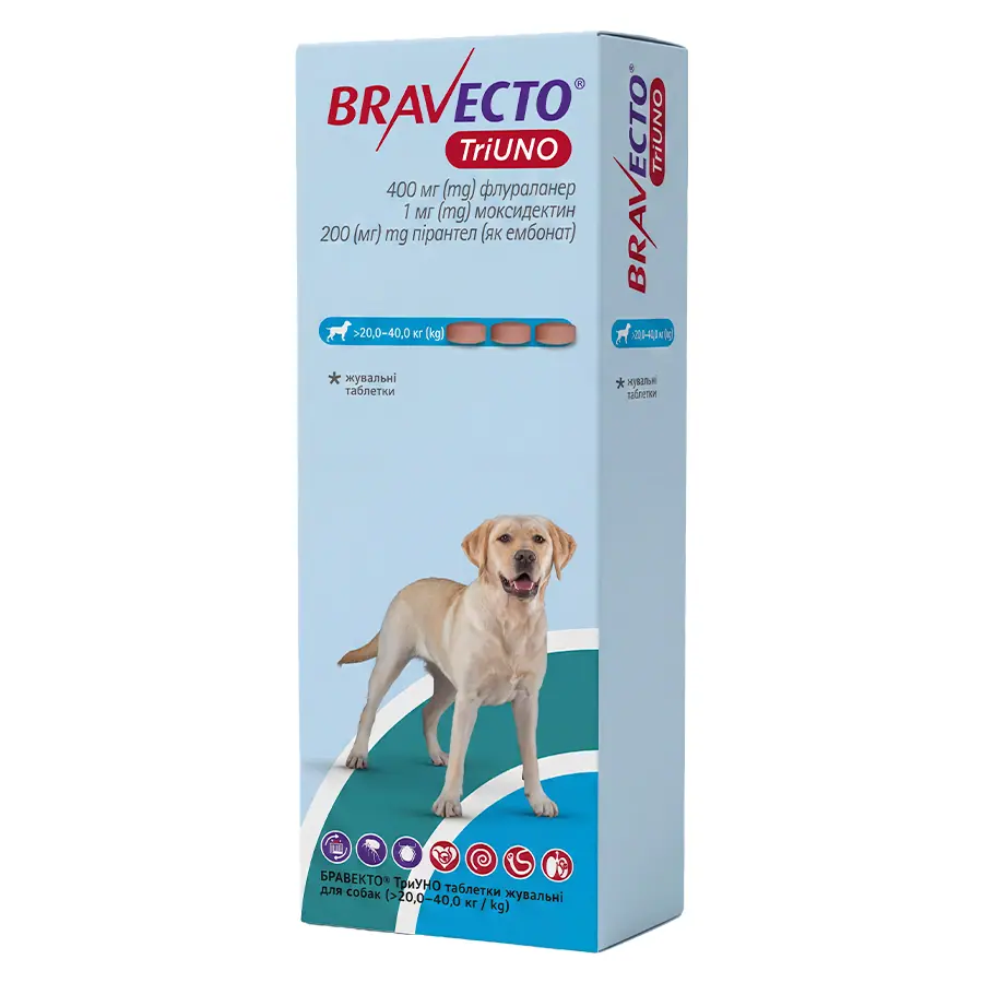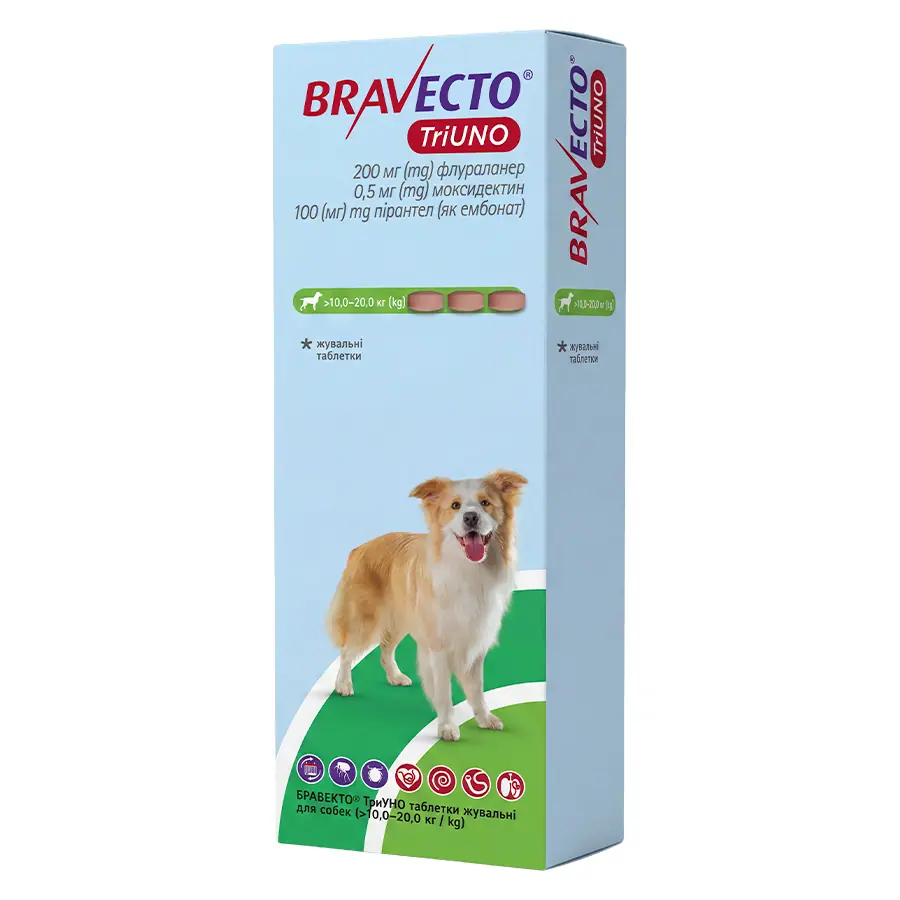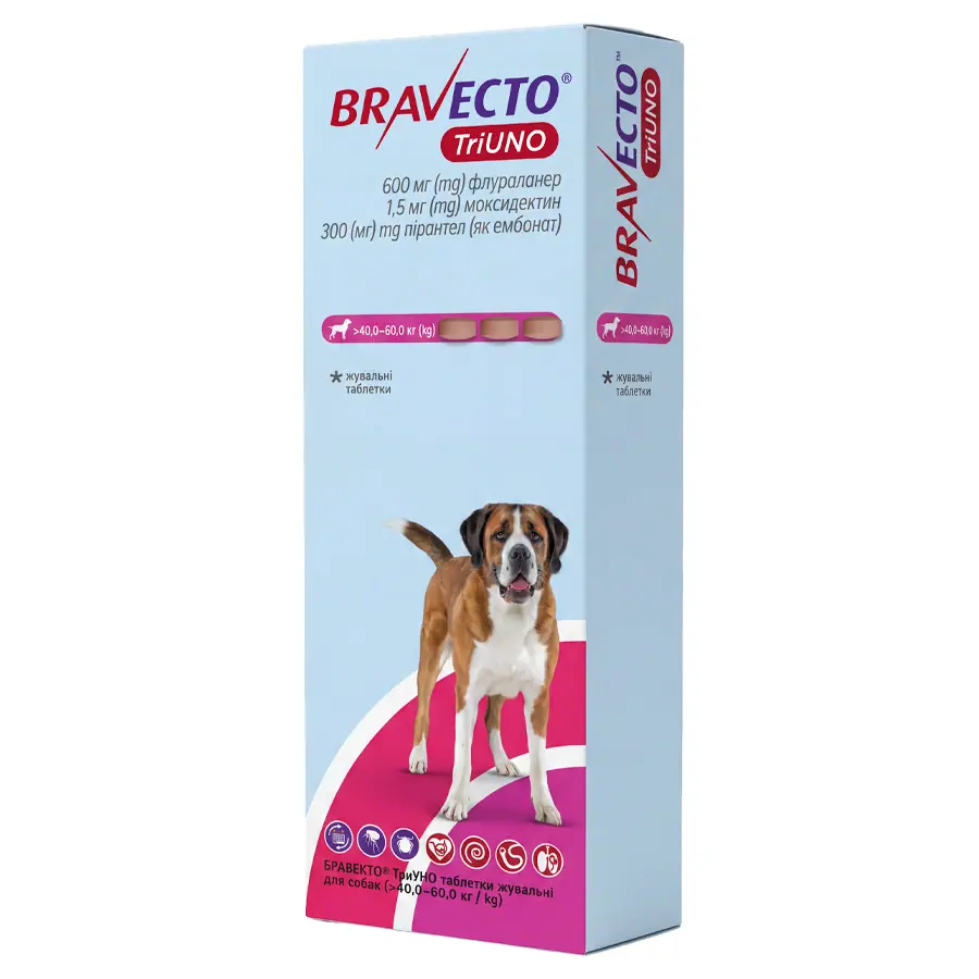 БРАВЕКТО® ТриУНО показаний для захисту від бліх та кліщів, лікування аскарид та анкилостом, а також профілактики дирофіляріозу та ангіостронгіліозу. Він знижує ризик зараження Babesia canis та Dipylidium caninum.
