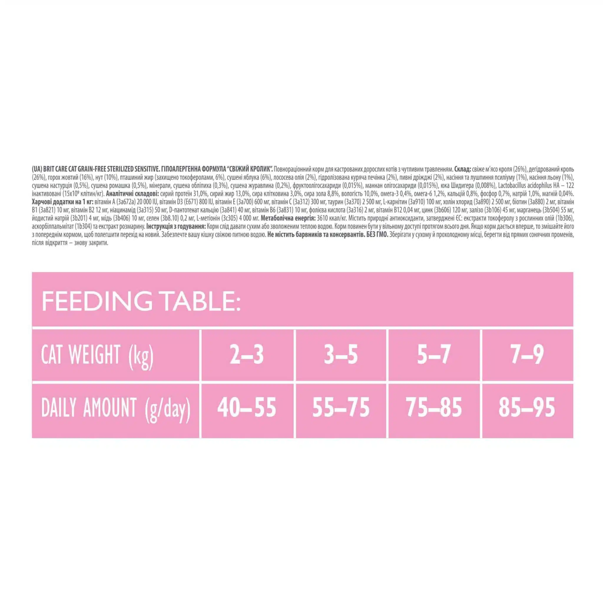 Склад: свіже м’ясо кролика (26%), зневоднений кролик (26%), жовтий горошок (16%), нут (10%), жир свійської птиці (консервований токоферолами 6%), сушені яблука (6%), олія лосося (2%) ), гідролізована печінка курки (2%), пивні дріжджі (2%), лушпиння та насіння подорожника (1%), насіння льону (1%), сушена настурція (0,5%), сушена ромашка (0,5%) , мінерали, сушена обліпиха (0,3%), журавлина сушена (0,2%), фрукто-олігосахариди (0,015%), маннан-олігосахариди (0,015%), юкка Мохаве, Lactobacillus acidophilus HA – 122 кг).