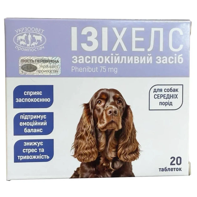 Ізіхелс у дозуванні для собак середніх порід містить 20 таблеток в упаковці. Заспокійливий засіб для зниження стресу і тривожності. Підходить для ситуацій, коли тварина нервує: подорожі, візити до лікаря, грози.