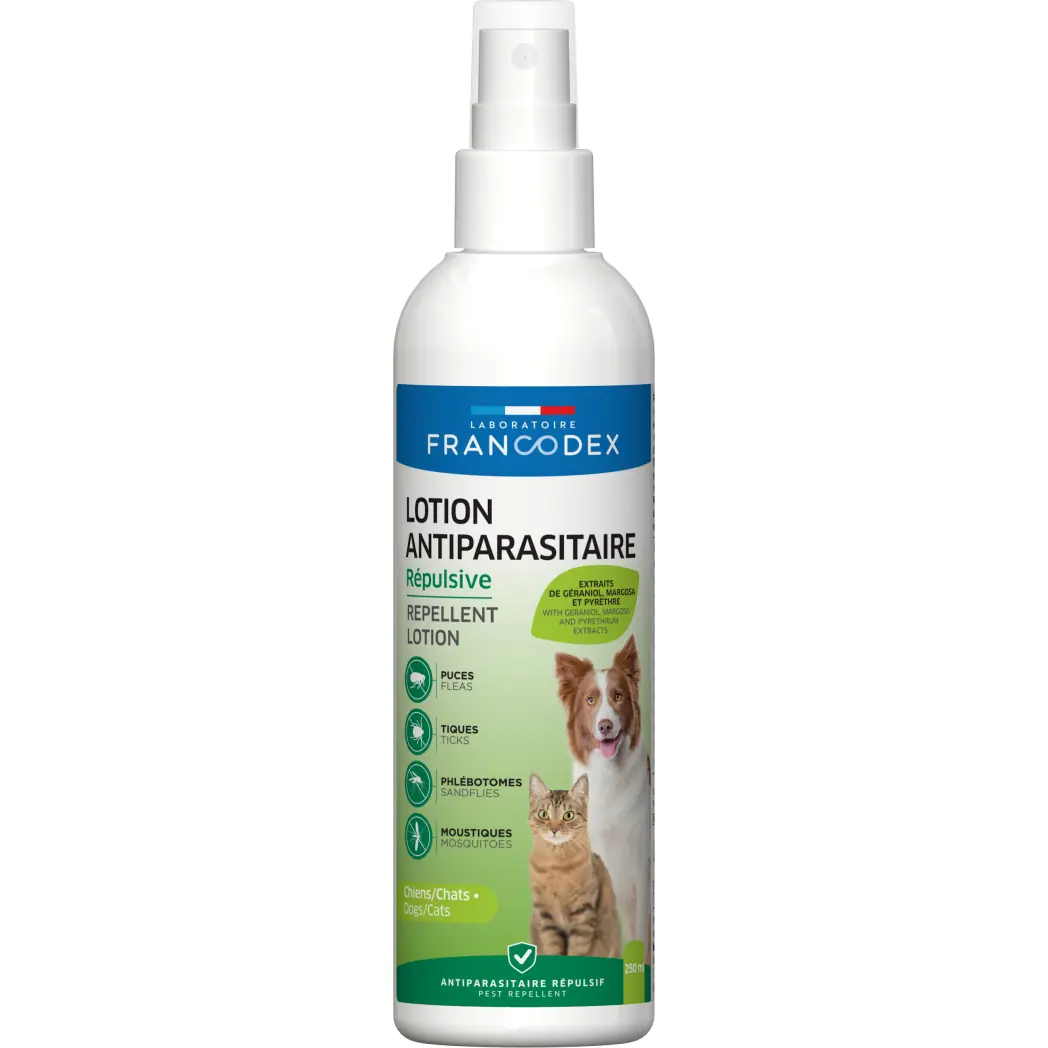 Виготовлений з маргози, піретруму та екстрактів гераніолу, репелентів для комах, REPELLENT LOTION FRANCODEX захищає вашу тварину від будь-якого зараження паразитами. Ідеально підходить для тварин, яких важко купати, лосьйон не вимагає змивання.