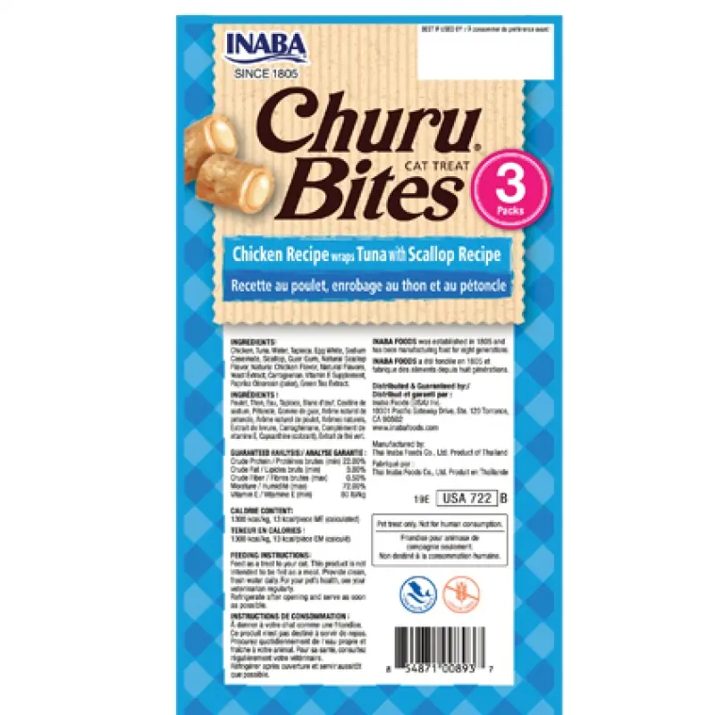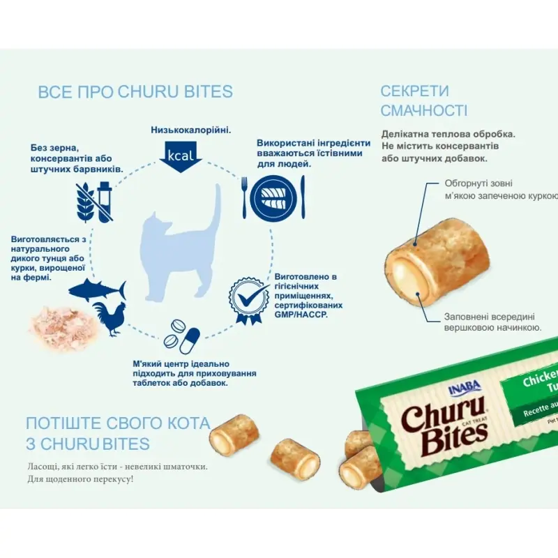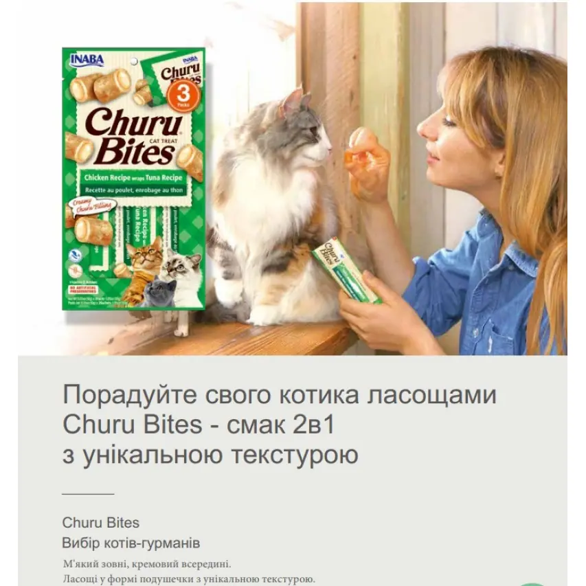 Ласощі для котів INABA Churu Bites – це м’які натуральні корисні курячі подушечки, приправлені натуральними ароматизаторами, екстрактом зеленого чаю і вітаміном Е.