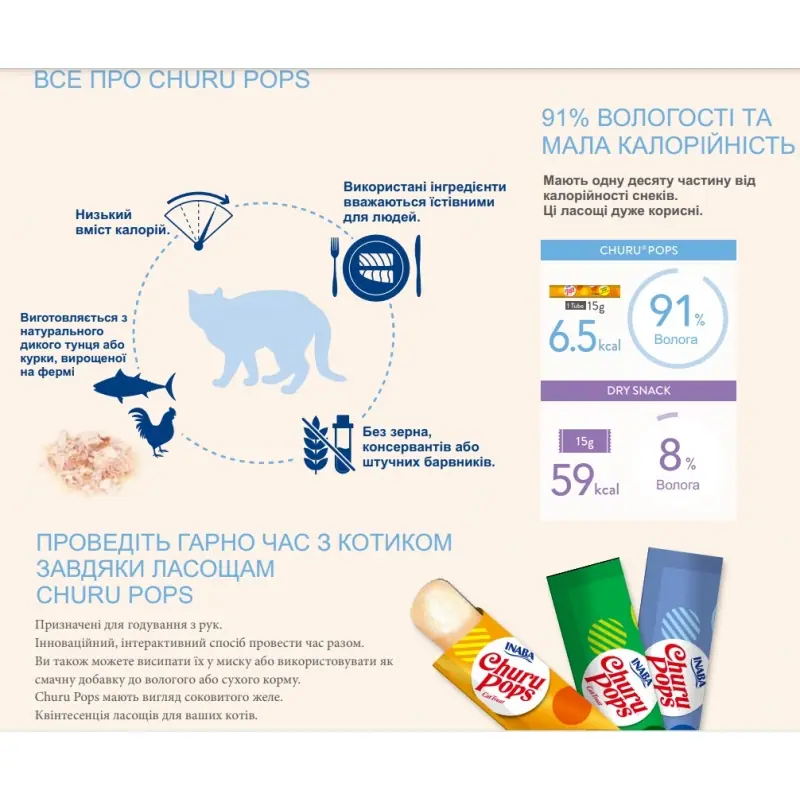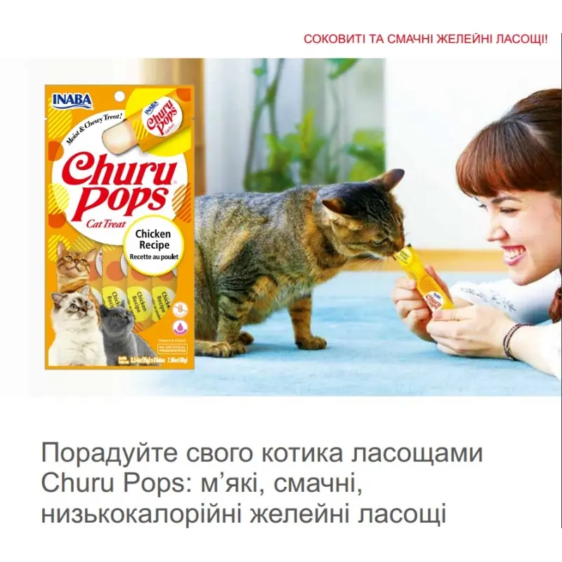 Inaba Churu Pops – м’які желейні ласощі для котів, зроблені зі справжнього м’яса та багаті поживними речовинами.