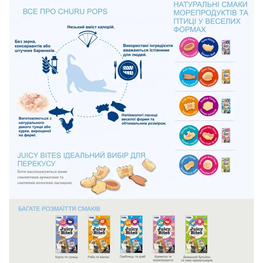 INABA Juicy Bites зі смаком креветок та морепродуктів — соковиті снеки для котів. Морський смак у м’якій текстурі. 3 порції по 11,3 г.