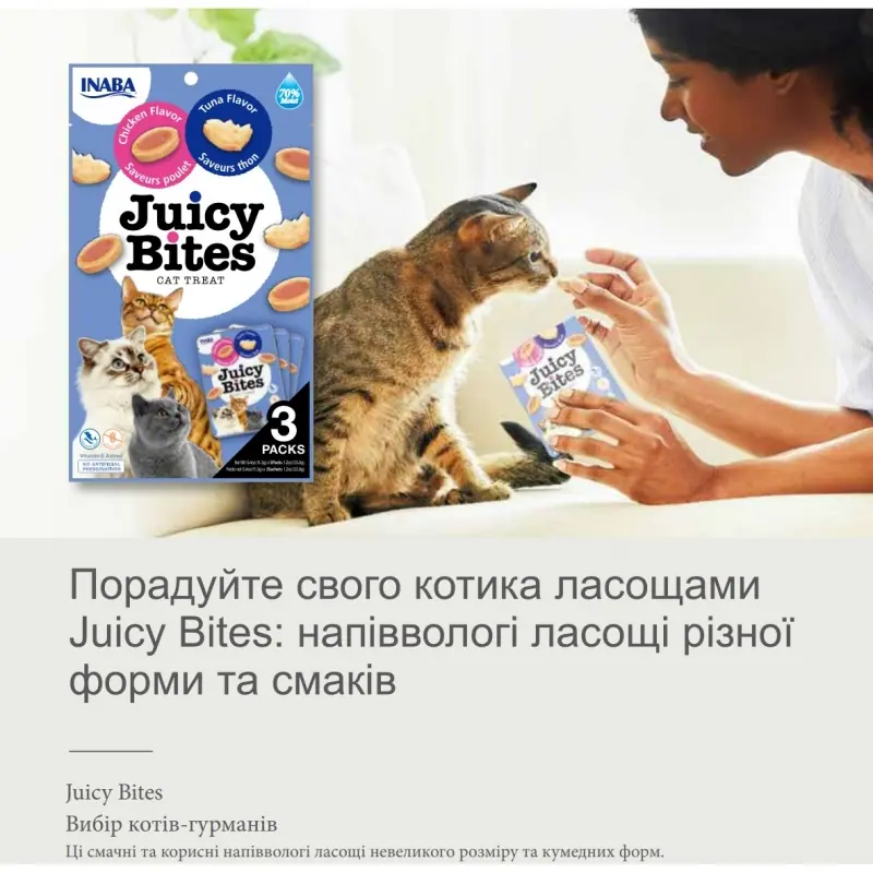 Беззернові ласощі Juicy Bites – це неперевершені вологі м’які шматочки різної форми з тунцем та куркою, приправлені натуральними ароматизаторами різних смаків, екстрактом зеленого чаю та вітаміном Е.