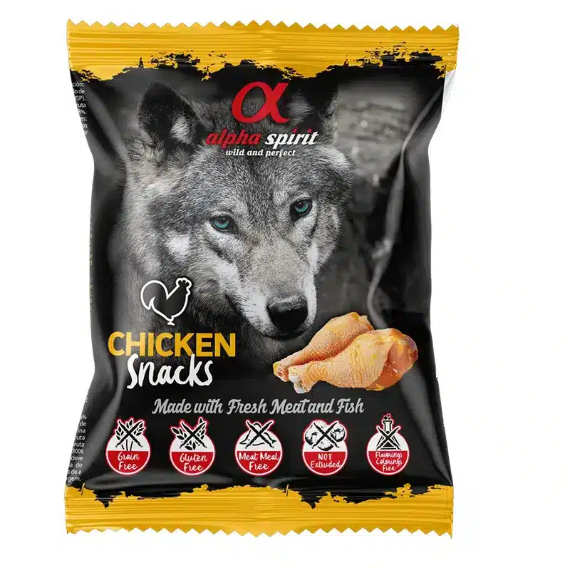 Alpha Spirit снеки з куркою в упаковці 50 г для дорослих собак. Іспанське виробництво з натуральної курятини. Підходять собакам зі схильністю до алергій.