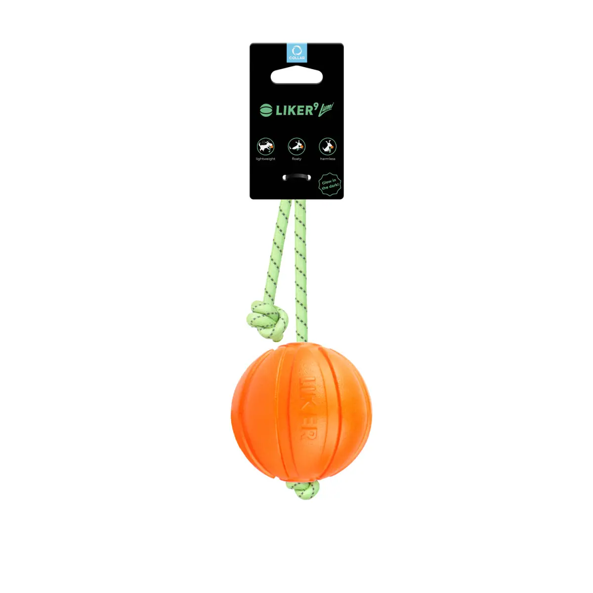 Liker Lumi 9 м’ячик зі шнурком для великих порід, який світиться у темряві. Збільшений діаметр для великих собак. Люмінесцентний матеріал видно в сутінках. Українське виробництво COLLAR.
