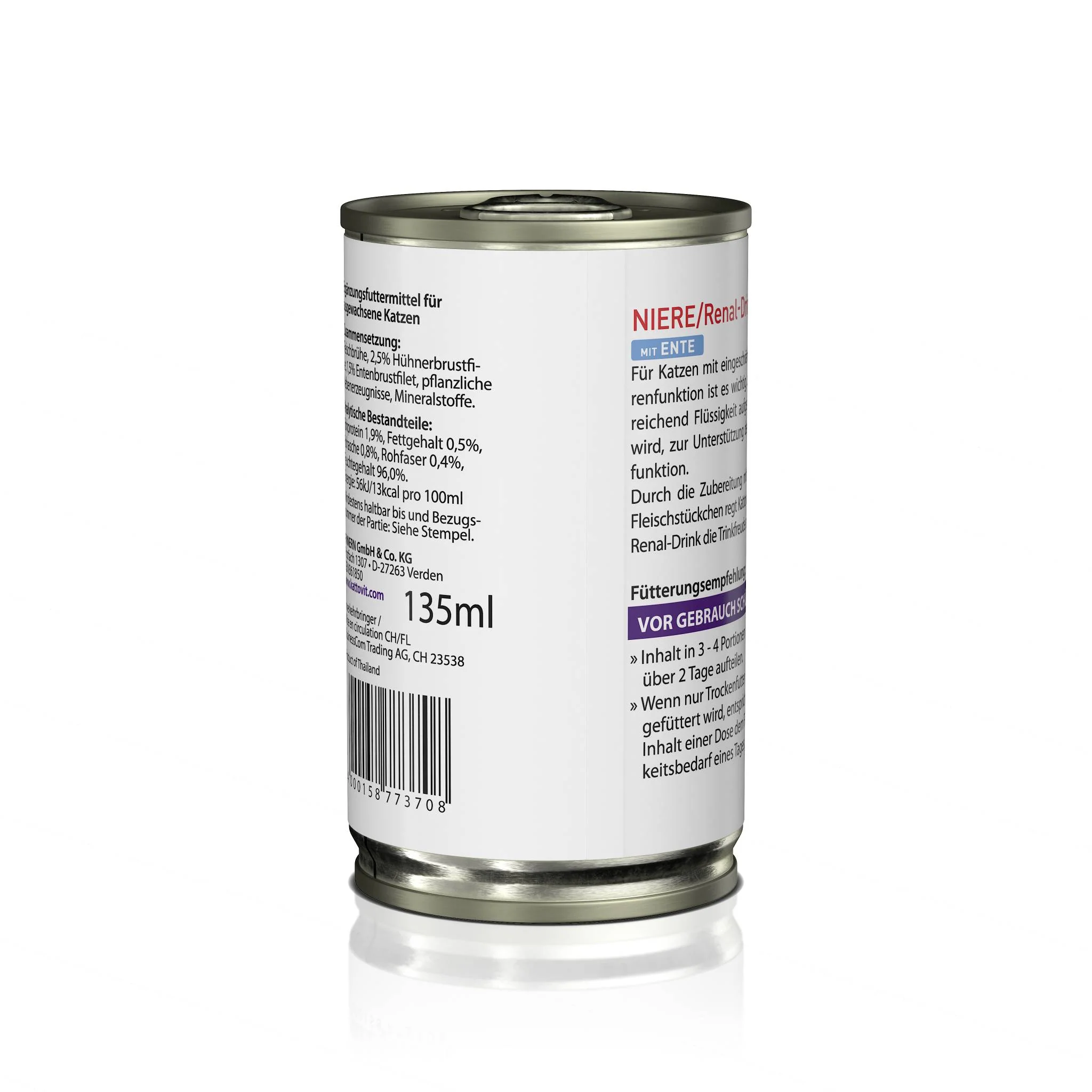 Коли в кота порушена функція нирок, забезпечення достатнього споживання рідини набуває особливого значення для підтримання його здоров’я. Kattovit Veterinary Niere Renal з качкою – це смачний лікувальний напій, призначений спеціально для таких випадків. М’який м’ясний бульйон із додаванням ніжних шматочків курячого та качиного філе не тільки привабливий за смаком, а й мотивує улюбленця пити більше, навіть якщо в нього зазвичай знижене бажання споживати воду. Високий вміст вологи в раціоні допомагає знизити навантаження на нирки, сприяє їхньому підтриманню та поліпшує загальне самопочуття кота.