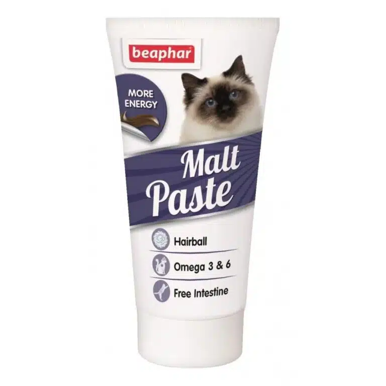 Beaphar Malt-Paste це паста для виведення грудок шерсті зі шлунка котів. Солодовий екстракт обволікає проковтнуту шерсть і виводить її природним шляхом. Рослинні олії пом’якшують вміст шлунка. Паста рекомендована довгошерстим котам і в період інтенсивного линяння.