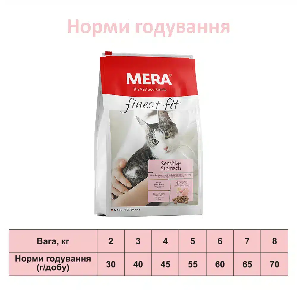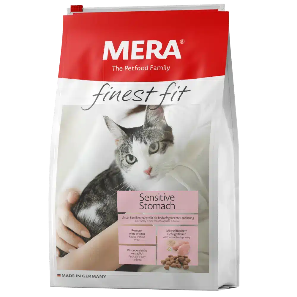 Сухий корм MERA finest fit Sensitive Stomach розроблений з урахуванням специфічних потреб котів з чутливим шлунком. Котам з чутливим шлунком потрібна особливо корисна їжа, що легко засвоюється. Інулін служить їжею для здорової кишкової флори і, отже, сприяє травленню. Маннан-олігосахариди та бета-глюкани можуть підтримувати імунний захист. Квітки ромашки, що містяться в ньому, відомі своєю спазмолітичною та протизапальною дією.