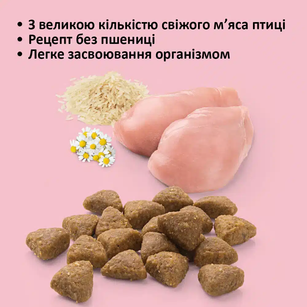 Sensitive Stomach – повноцінний корм для чутливих котів. Зі свіжим м’ясом птиці та ромашкою для особливо корисного та легкозасвоюваного корму.