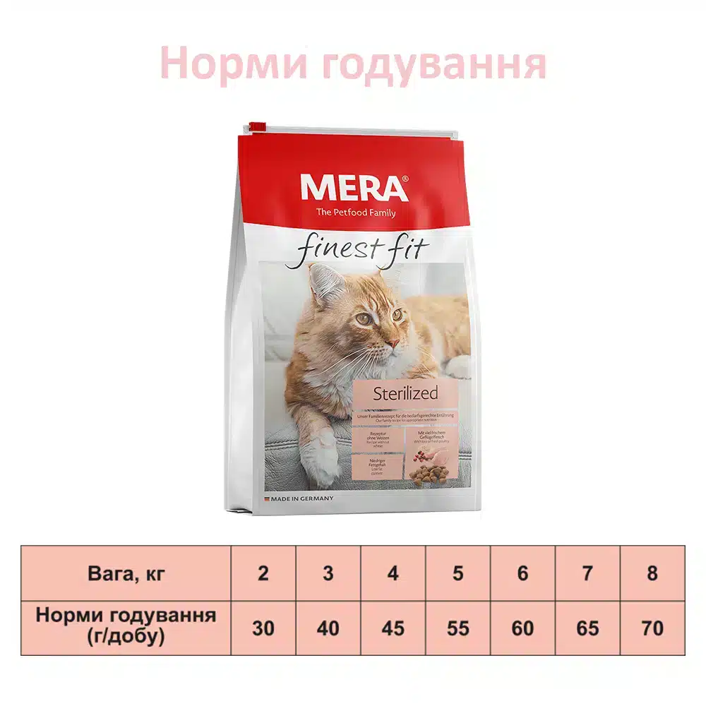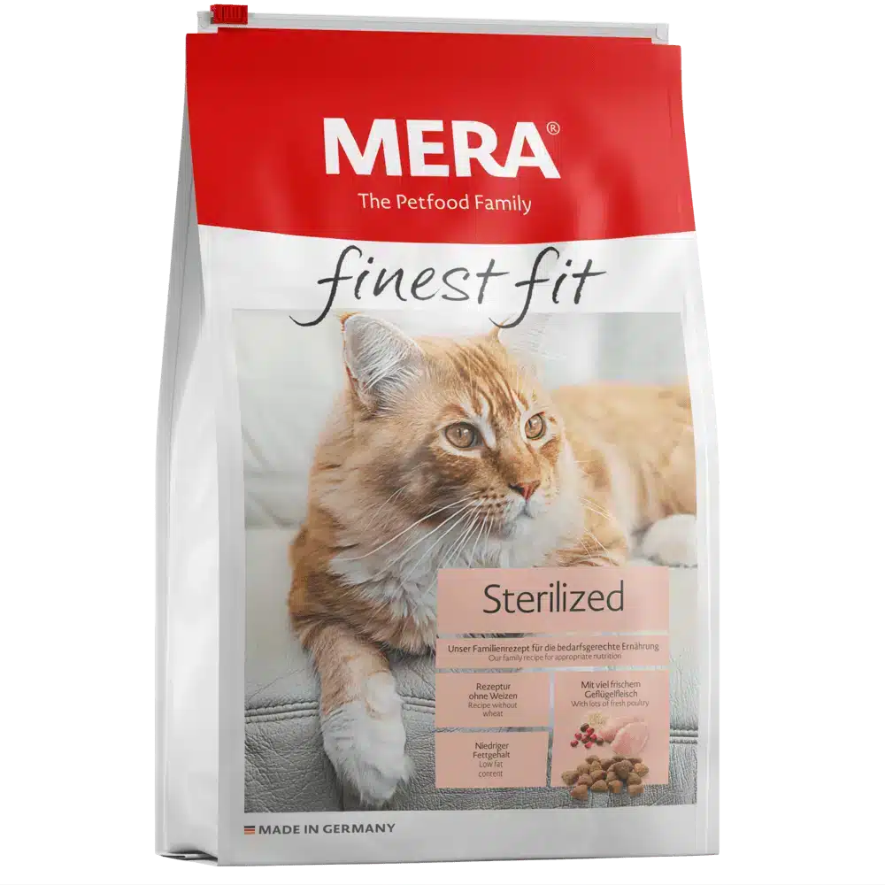 Сухий корм MERA finest fit Sterilized розроблений з урахуванням специфічних потреб стерилізованих котів. Стерилізація змінює обмінні процеси в організмі, що часто призводить до набору ваги. Котам потрібна дієта з низьким вмістом жирів для збереження енергії. З іншого боку, їжа повинна мати високий вміст білка, щоб підтримувати м’язи. Крім того, особлива комбінація мінералів може запобігти утворенню каменів у нирках.
