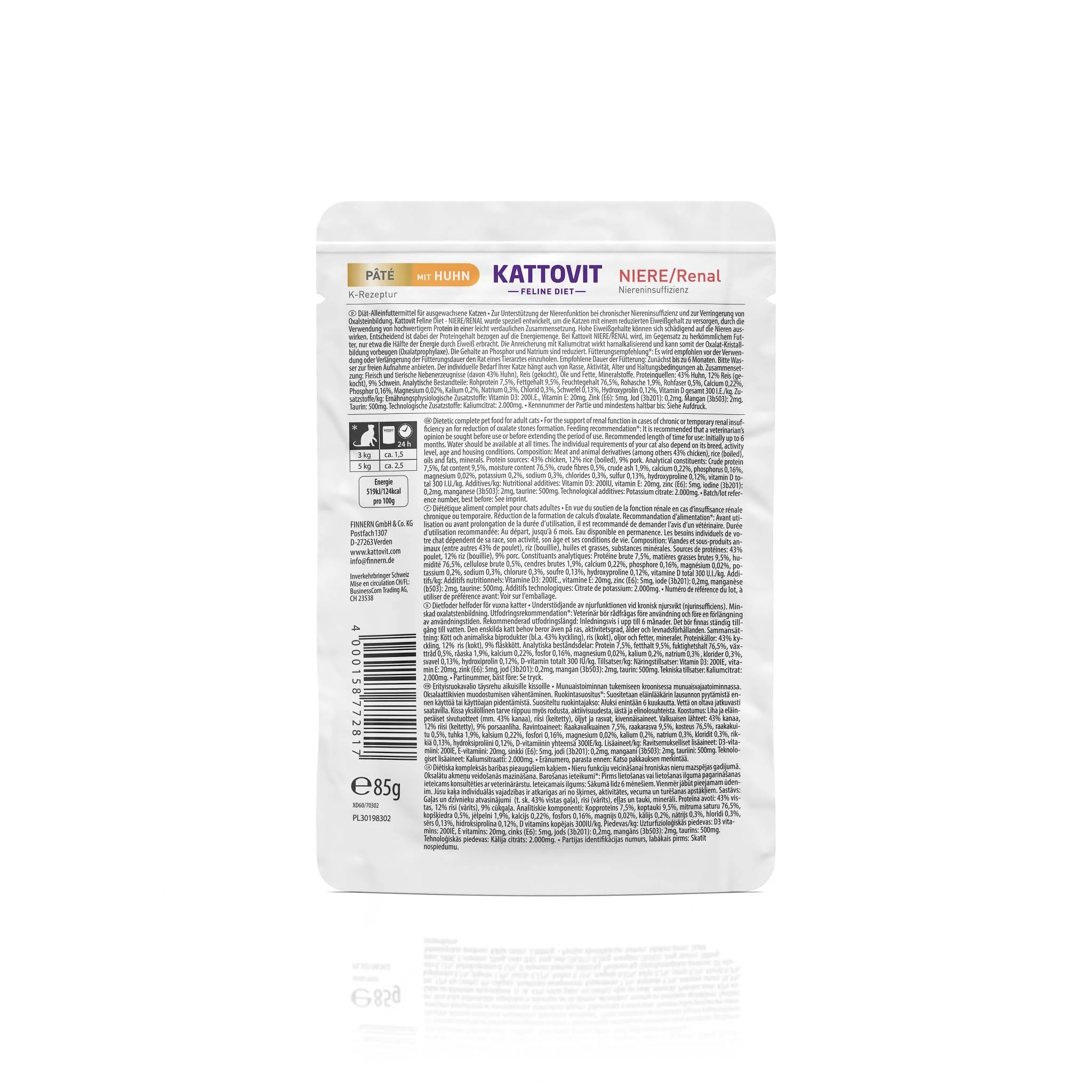 Лікувальний корм Kattovit Veterinary Niere Renal з куркою – це повноцінний дієтичний раціон у вигляді паштету, спеціально приготований для дорослих котів iз хронічною або тимчасовою нирковою недостатністю та схильністю до утворення оксалатних каменів. Він допомагає полегшити навантаження на нирки завдяки ретельно підібраній рецептурі зі зниженим вмістом фосфору та натрію і обмеженою кількістю білка. На відміну від звичайних кормів, у яких білок може бути основним джерелом енергії, в Kattovit Veterinary Niere Renal з куркою приблизно половина енергетичної цінності забезпечується завдяки іншим інгредієнтам, що дуже важливо для котів з ослабленою нирковою функцією. Для приготування використовується тільки високоякісний легкозасвоюваний білок, а його помірна кількість знижує ризик подальшого пошкодження нирок.