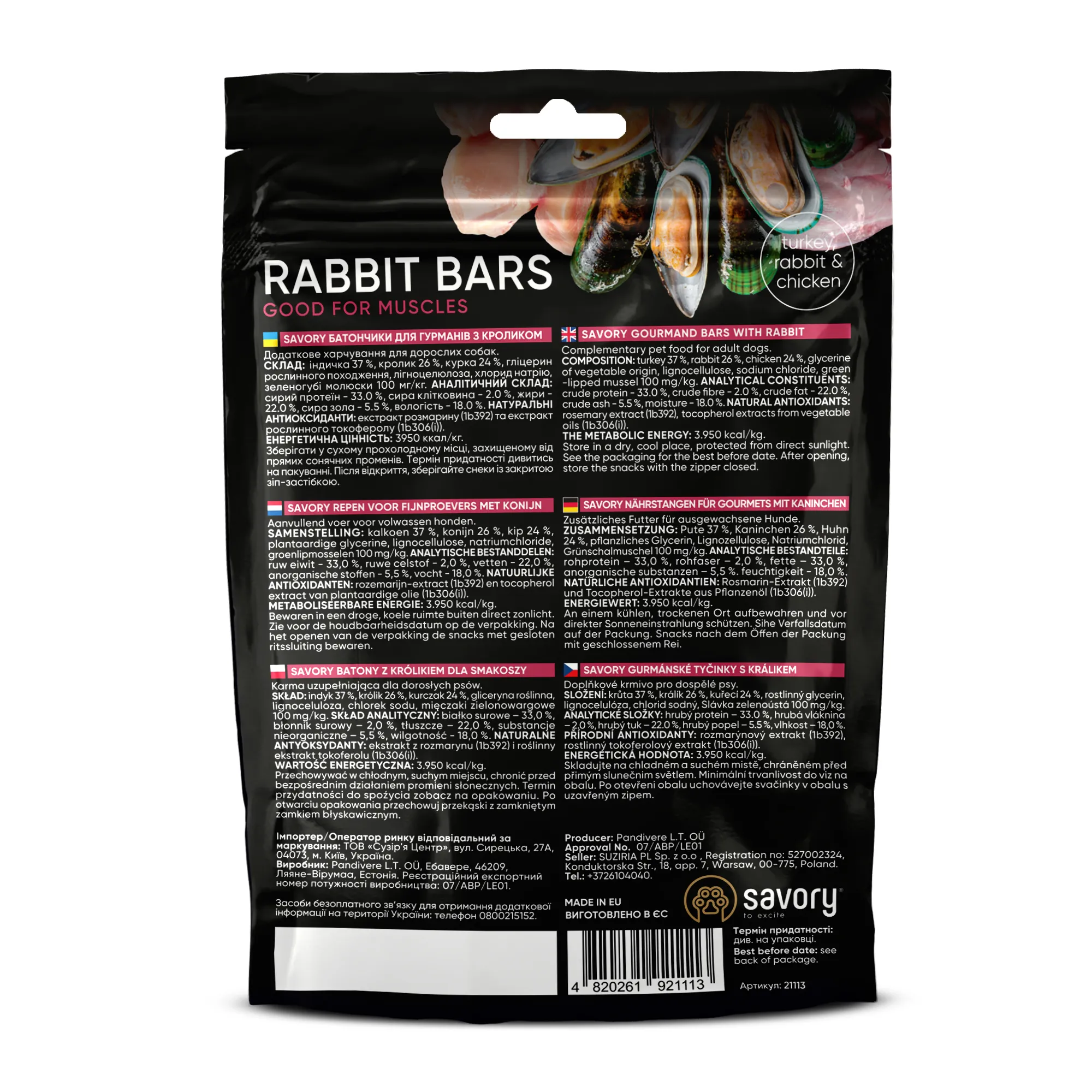 Savory батончики з кроликом це беззернові ласощі для дорослих та літніх собак. Кролик як дієтичний білок добре засвоюється. Чеське виробництво, 100 г.