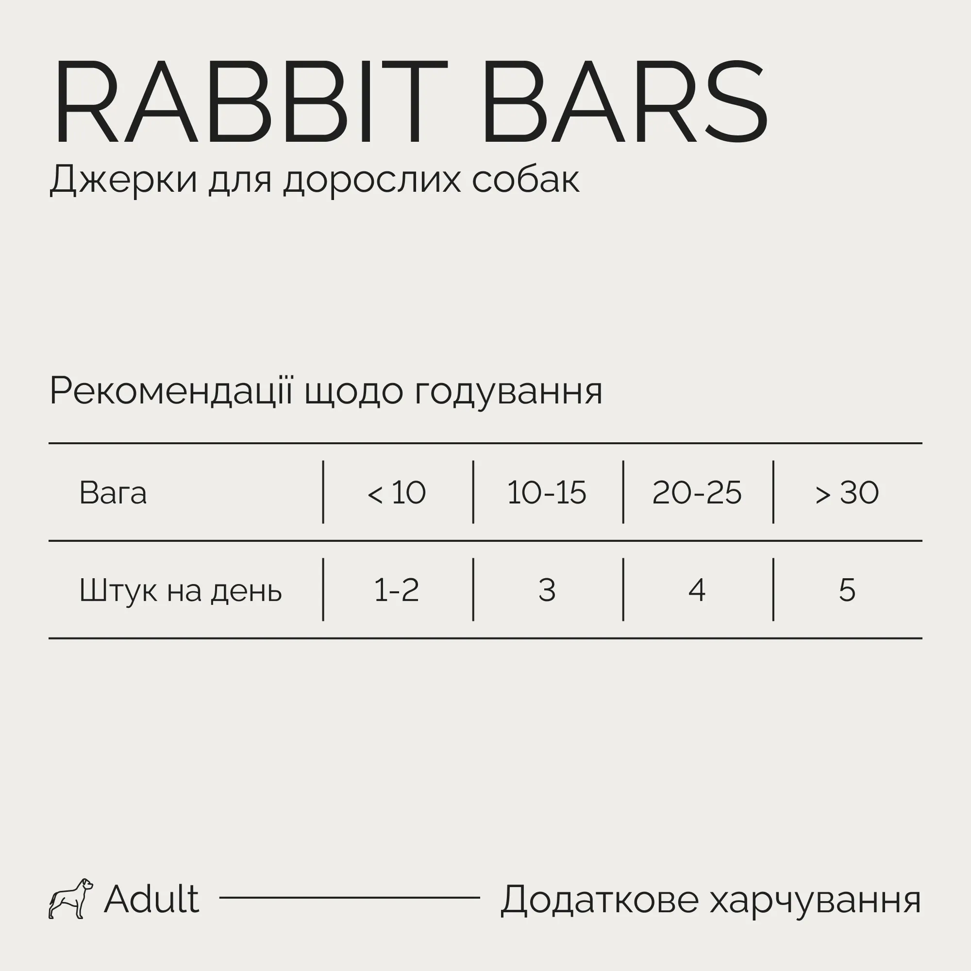 Джерки для дорослих собак Батончики з кроликом містять 87% справжнього м’яса кролика, індички та курки, не містить ГМО, не містить зернових.
