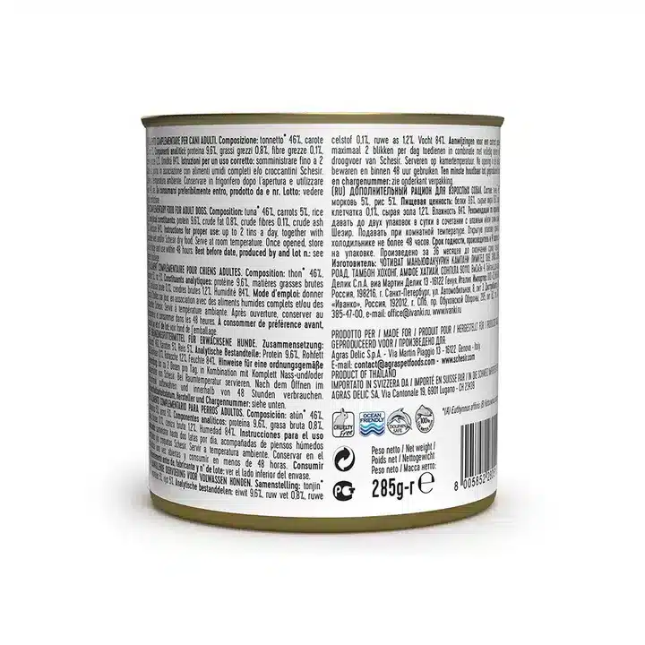 Вологий корм Schesir Tuna With Carrots можна використовувати як смачне доповнення до основного раціону собак, або як чудове частування, яким можна потішити улюбленця в особливих випадках. Консерви рекомендуються для дорослих собак усіх порід віком від 1 року і старших.