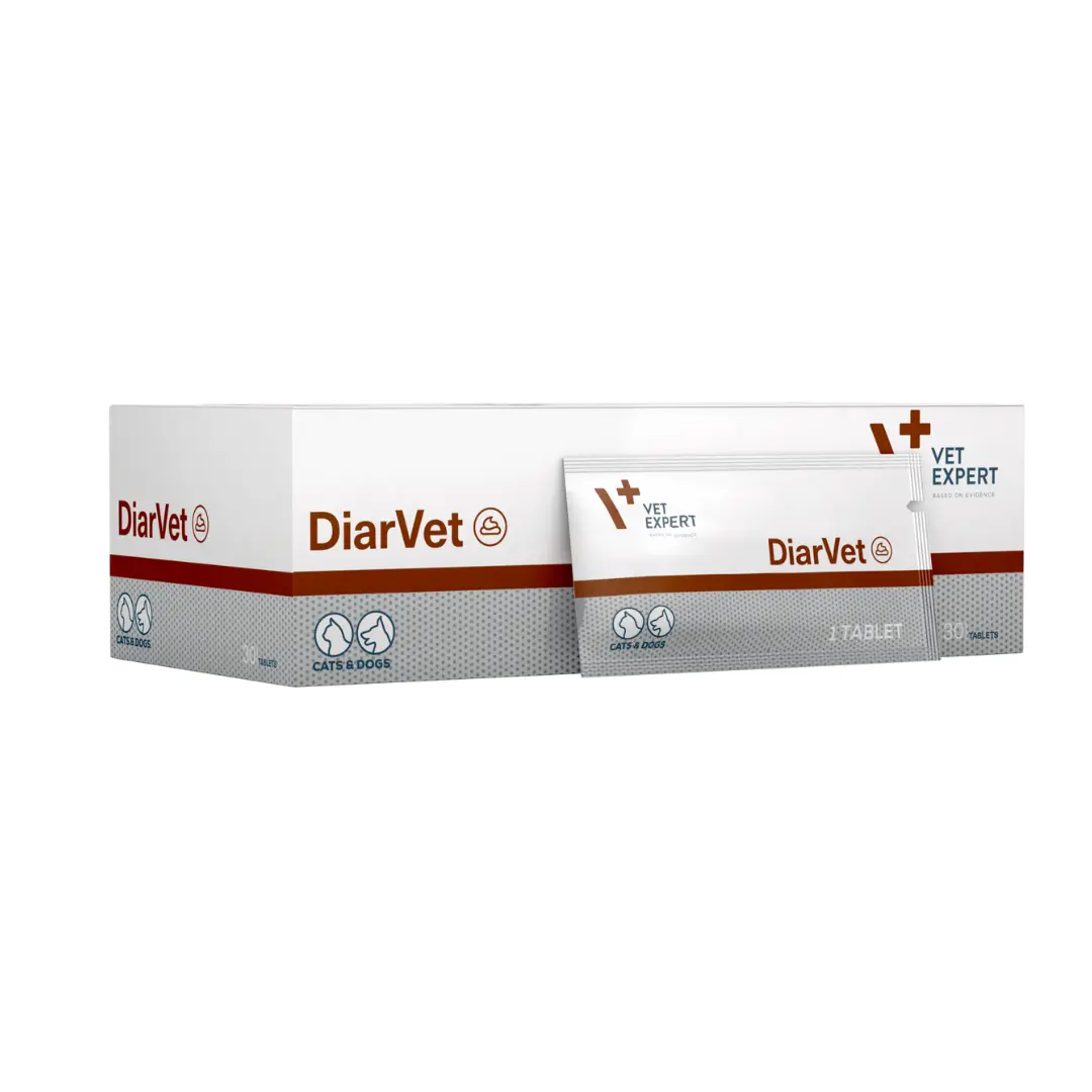VetExpert DiarVet у формі таблеток призначений при діареї у котів та собак. Пектини зв’язують зайву рідину та токсини в кишечнику. Електроліти запобігають зневодненню. Препарат доступний у фасуванні 6 та 30 таблеток залежно від тривалості курсу.